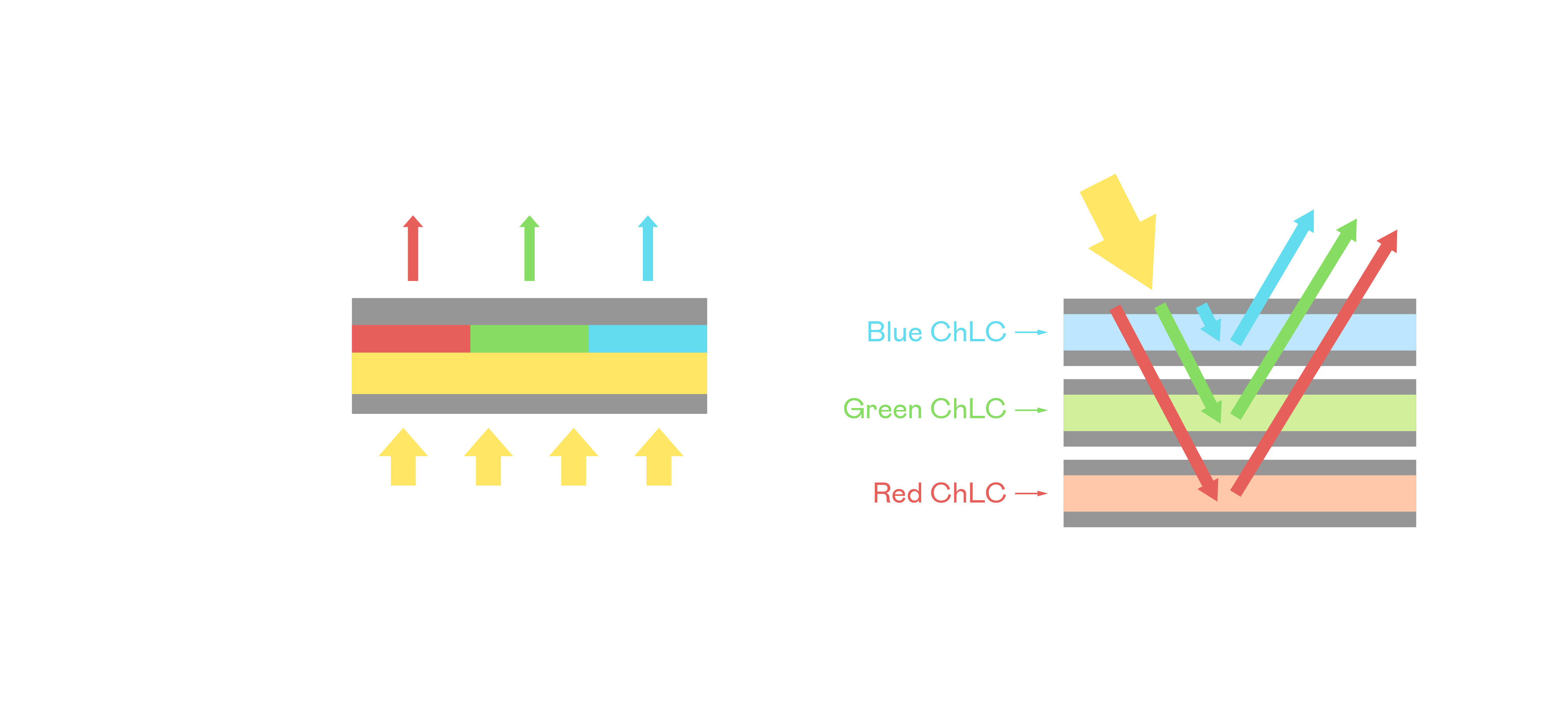 AG尊龙胆固醇液晶显示器是由红、绿、蓝三层胆固醇液晶面板堆叠而成,并采用无彩色滤光片设计,减少环境光在反射过程中的损耗。